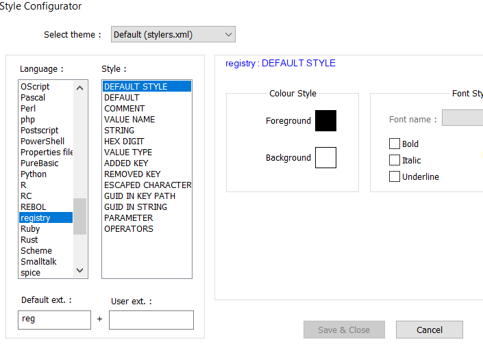 Quite possibly you have a corruption in this file at this location. If you look at the same file in the installed folder (where Notepad++ resides), so either “Program Files” or “Program Files x86” you might see the content referring to the “registry”. If so then consider copying this file over top of the one in the %appdata%\Notepad++ folder. Bear in mind that any alterations you have done in the style configurator will be lost, so the other option will be to copy just the relevant lines from the good stylers.xml file to the bad file.